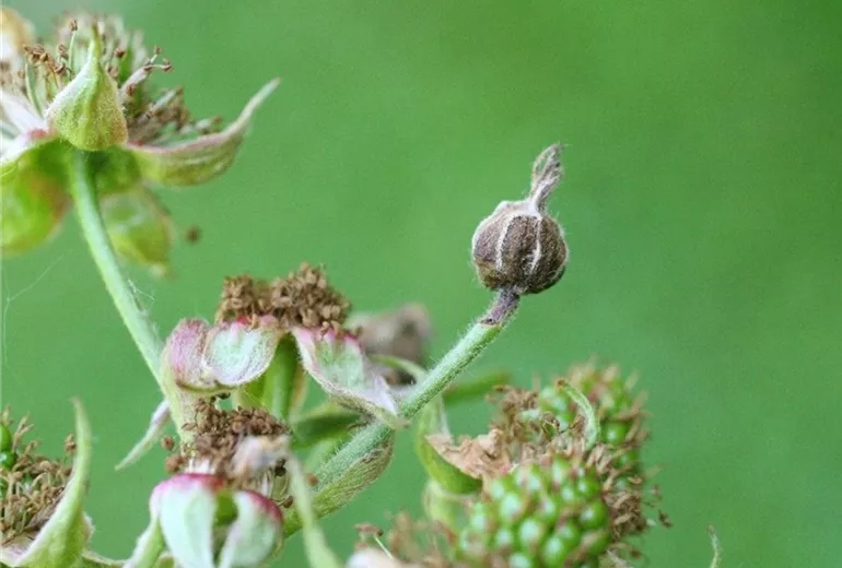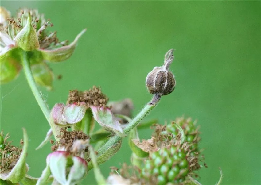 Die Blütenknospen der Brombeere knicken unterhalb des Blütenbodens ab. Am Blütenstiel, ist die punktartig Fraßstelle des Schädlings zu erkennen. Die Blüten trocknen ein.