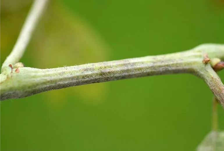 Ab Ende Mai/Anfang Juni entsteht auf den Blättern und Trieben ein weißgraues, spinnwebenartiges Geflecht, das häufig nicht erkannt wird. Später färbt sich das Pilzgeflecht grau.
