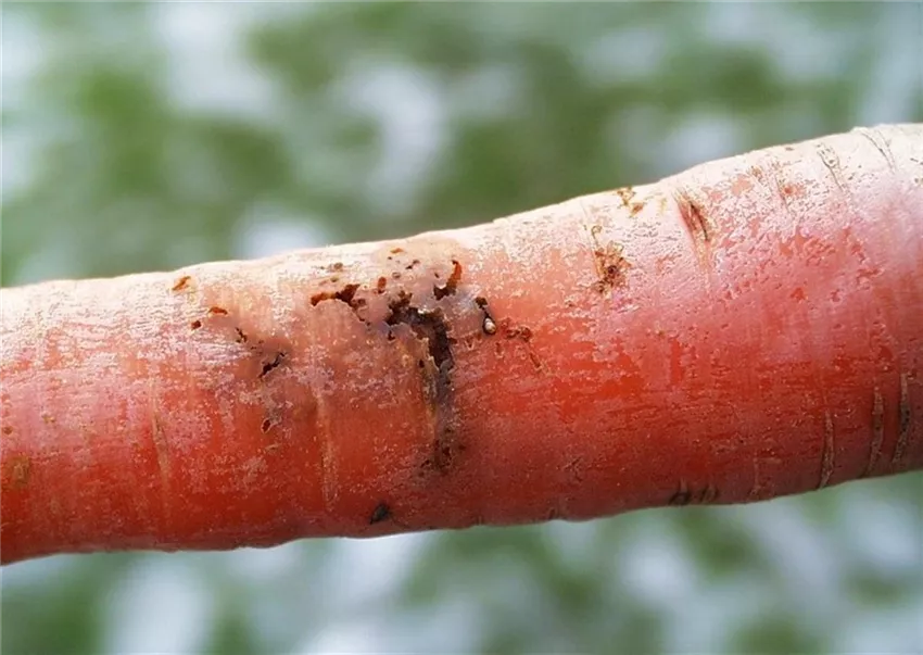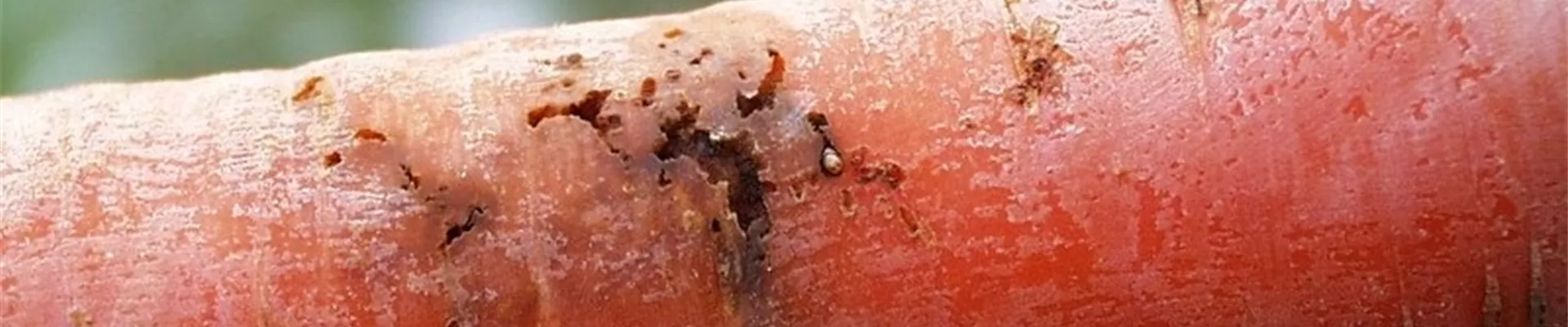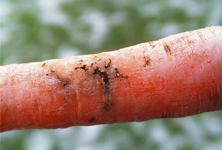 In den Rüben der Möhre befinden sich rostbraun gefärbte Fraßgänge, in denen oftmals die Larven (Maden) der Möhrenfliege zu finden sind. Die Möhren haben einen unangenehmen Beigeschmack.