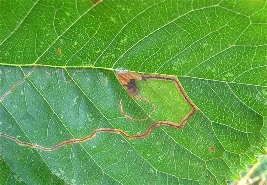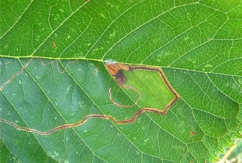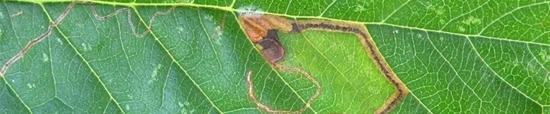 Die Blätter weisen deutliche braune Schlangenlinien im Blattgewebe auf. Bei genauerer Betrachtung kann man erkennen, dass es sich um Fraßgänge handelt. In den Fraßgängen befinden sich z.T. die Larven der Obstbaum- oder Schlangenminiermotte.