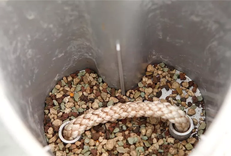 Zum Umfang vieler wasserspeichernder Pflanzgefäße gehört auch ein Wasserstandsanzeiger. Prüfen Sie, ob dieser auch funktionstüchtig ist. Stellen Sie also sicher, dass der Anzeigenstab sich nicht verhakt hat und stecken Sie ihn in den dafür vorgesehenen Platz.