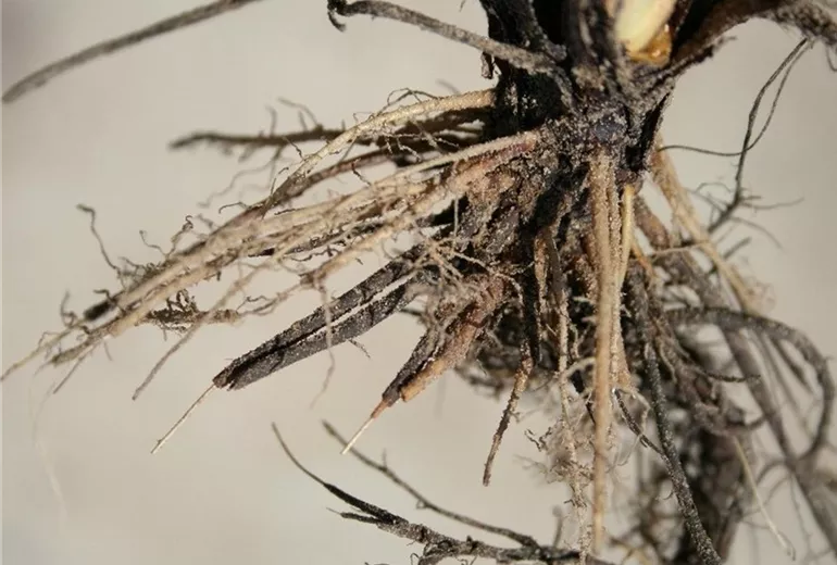 Pflanzen kümmern und gehen zum Teil ein. Gräbt man betroffene Erdbeerstauden aus, fällt auf, dass viele Wurzeln schwarz gefärbt sind und sich die Wurzelhaut wie eine Hülle abziehen lässt. Neue Wurzeln werden kaum gebildet.