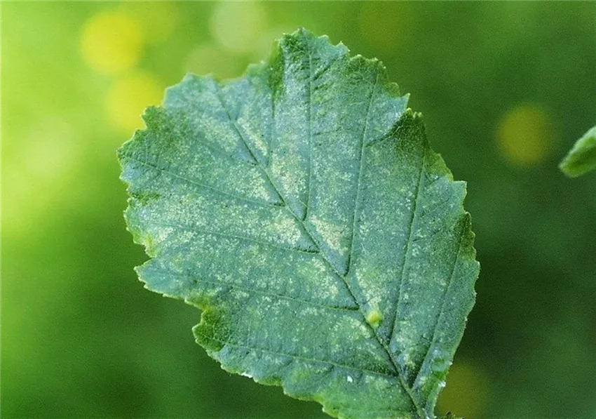 Die Blätter erscheinen silbrig weiß gesprenkelt. Bei starkem Befall verfärbt sich das ganze Blatt silbrig grau.