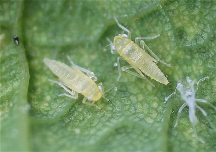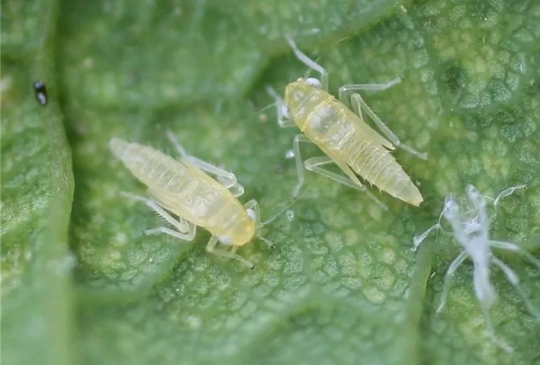Auf der Blattunterseite sind die hellgrünen Larven und z.T. auch die geflügelten erwachsenen Zikaden zu sehen. Die Tiere haben Ähnlichkeit mit Blattläusen, sind aber beweglicher als diese.