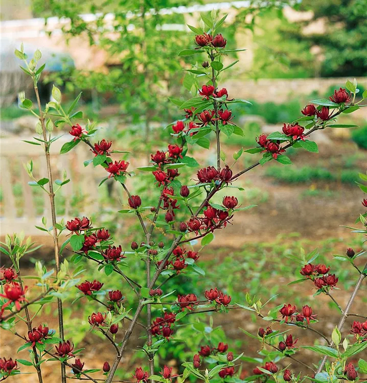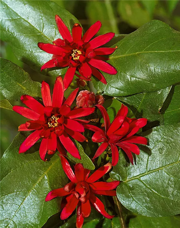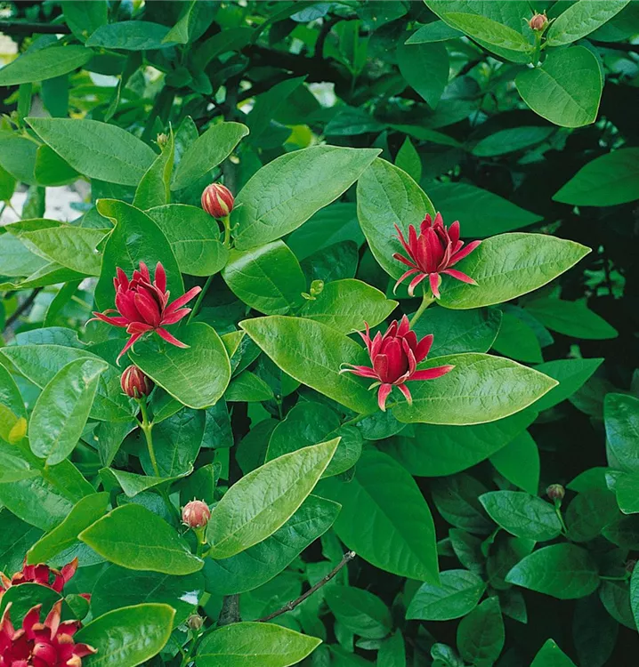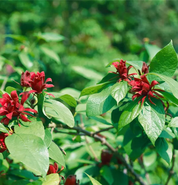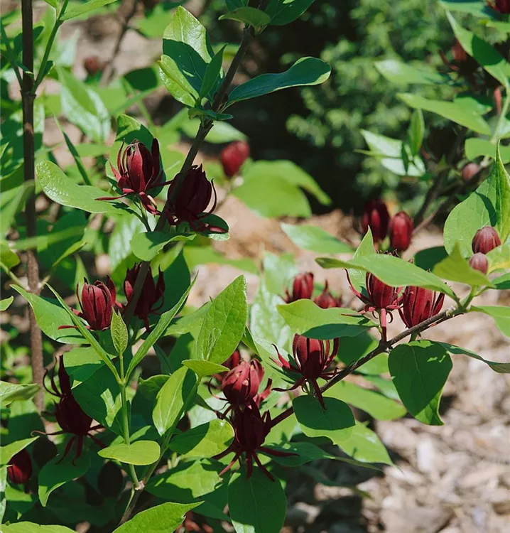 Der Gewürzstrauch (Calycanthus floridus) ein aufrechter Strauch, der, je nach Sorte, Blüten in verschiedenen Farben hervorbringt. Seine Rinde ist grünbraunduftend. An einem sonnigen bis halbschattigen, windgeschützten Standort mit durchlässigem, nährstoffreichem Boden erreicht er gewöhnlich eine Höhe von ca. 3 m und wird ca. 2 m breit.