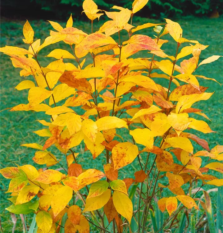 Die sommergrünen Blätter des Gewürzstrauchs sind mittelgrün, lanzettlich, glänzend, gegenständig. Diese sind etwa 7 - 12 cm groß. Gewürzstrauch zeigt sich leuchtend gelb im Herbst.