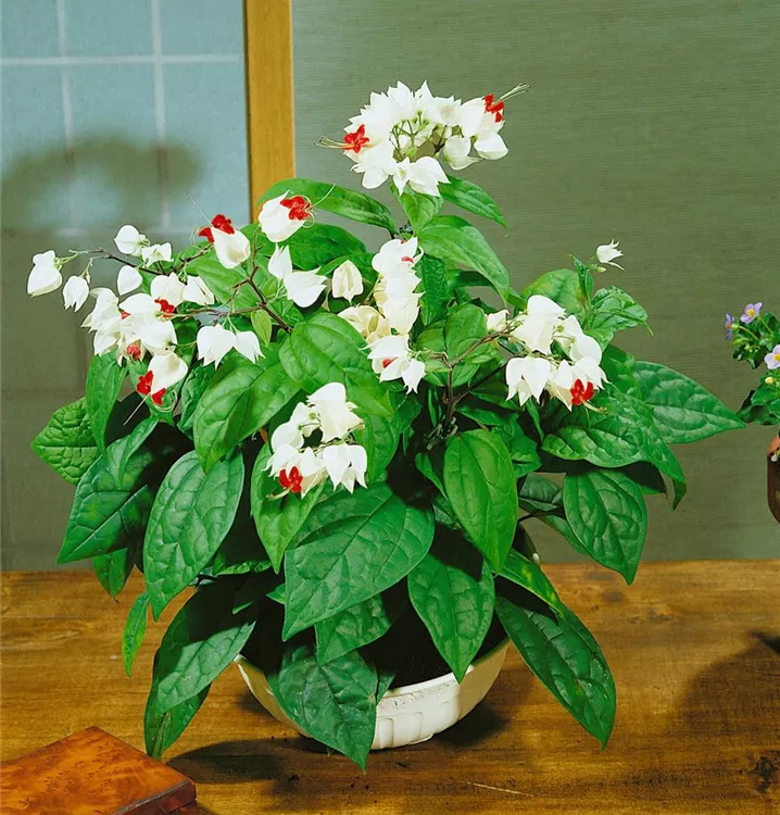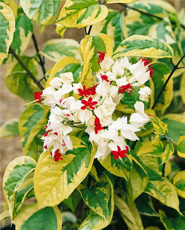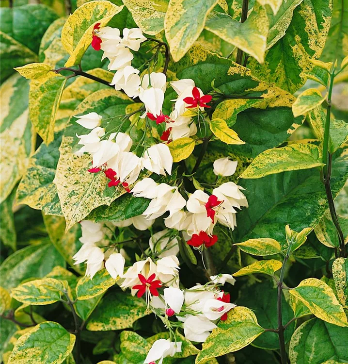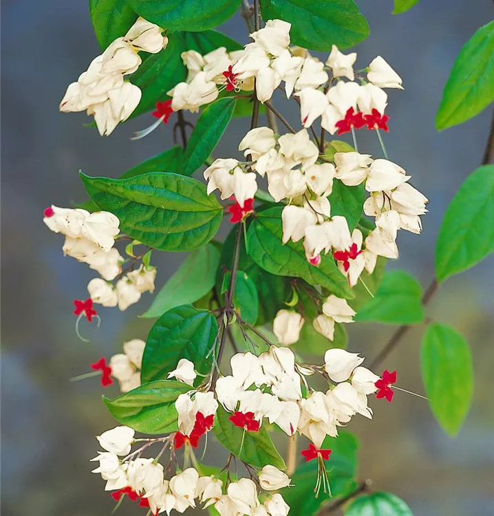 Der Kletternde Losstrauch (Clerodendrum thomsoniae) ist eine sehr beliebte Kübelpflanze. Seine dekorativen Blüten sind glockenförmig und erscheinen von Juni bis Oktober. Verwenden Sie bevorzugt die spezielle Kübelpflanzenerde, denn sie verdichtet sich über längere Zeit nicht.