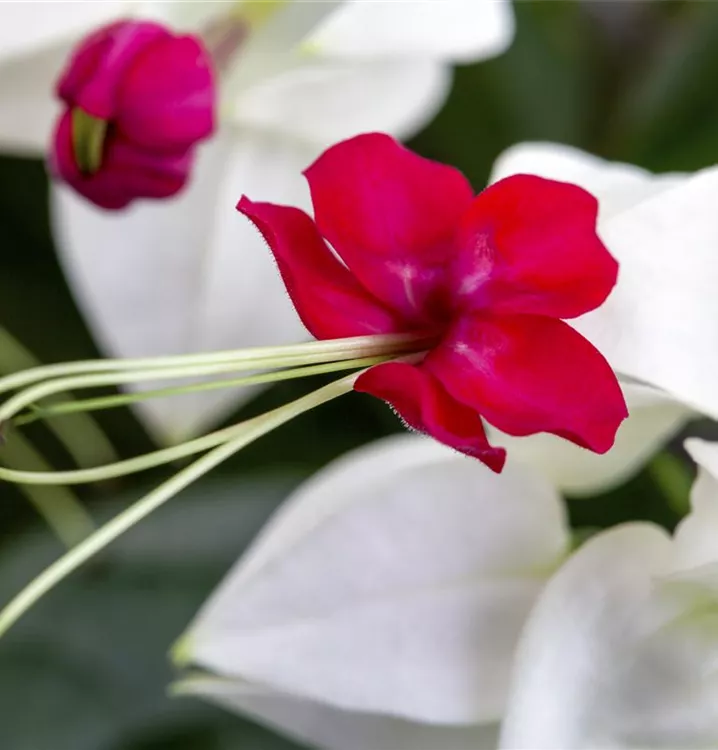 Clerodendrum thomsoniae bildet während der gesamten Saison zahlreiche glockenförmige, in Rispen angeordnete, rot-weiße Blüten.