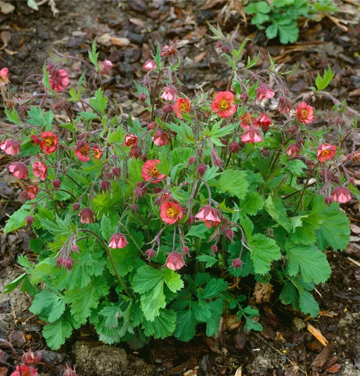 Geum rivale bildet schalenförmige, mehrfarbige Blüten ab April.