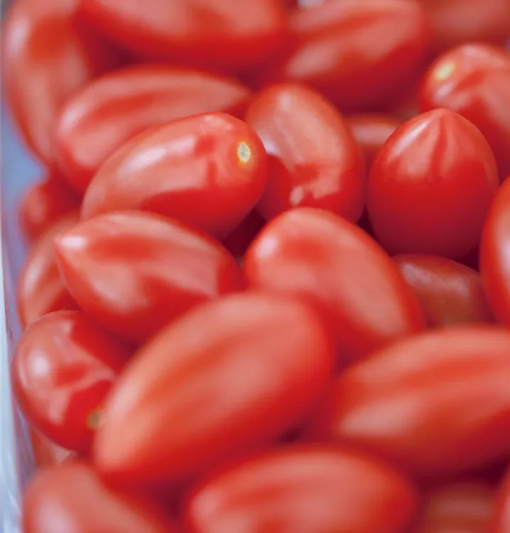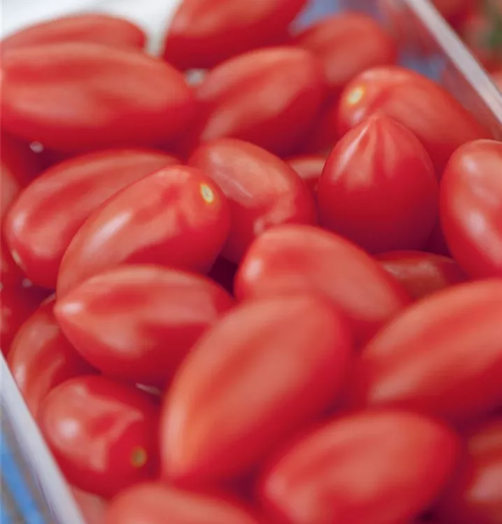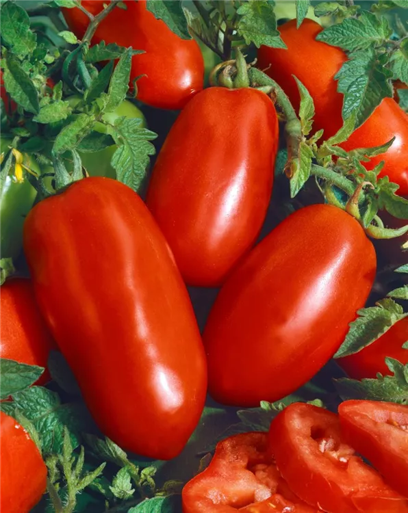 Die Tomate 'San Marzano' (Solanum lycopersicum) bildet mittelgroße Früchte, die aromatisch, fruchtig schmecken und bereits ab Juli geerntet werden können. Für das optimale Wachstum der Tomate 'San Marzano' werden ein sonniger Standort und durchlässiger, nährstoffreicher Boden benötigt.