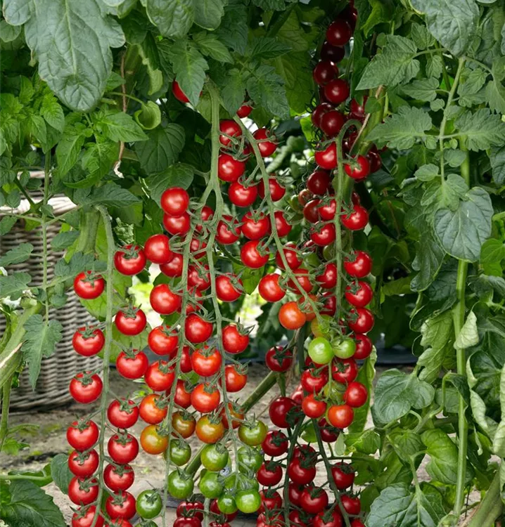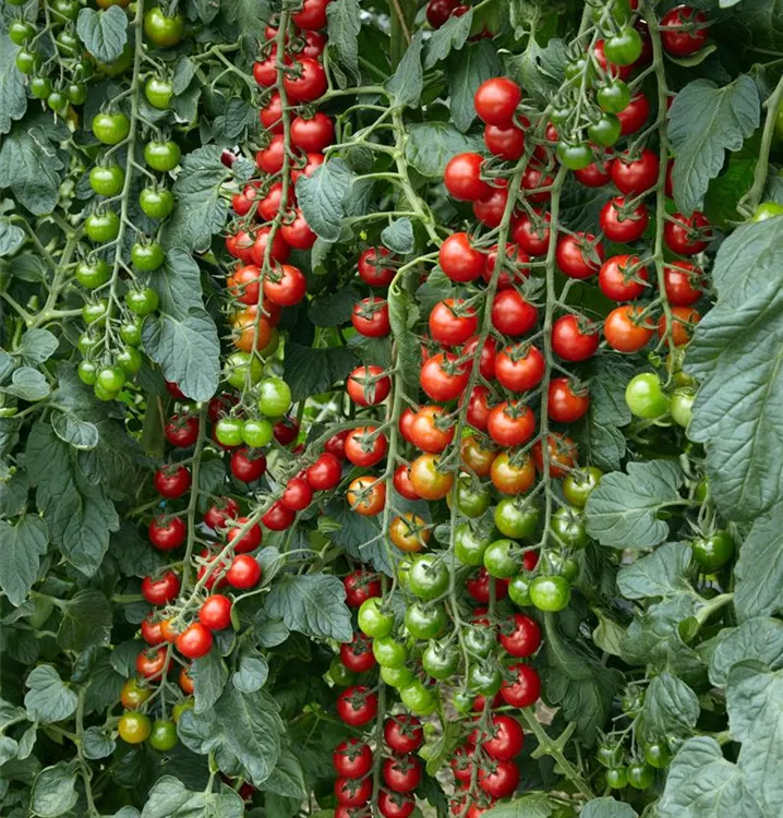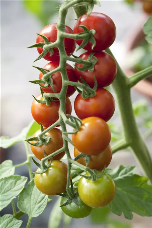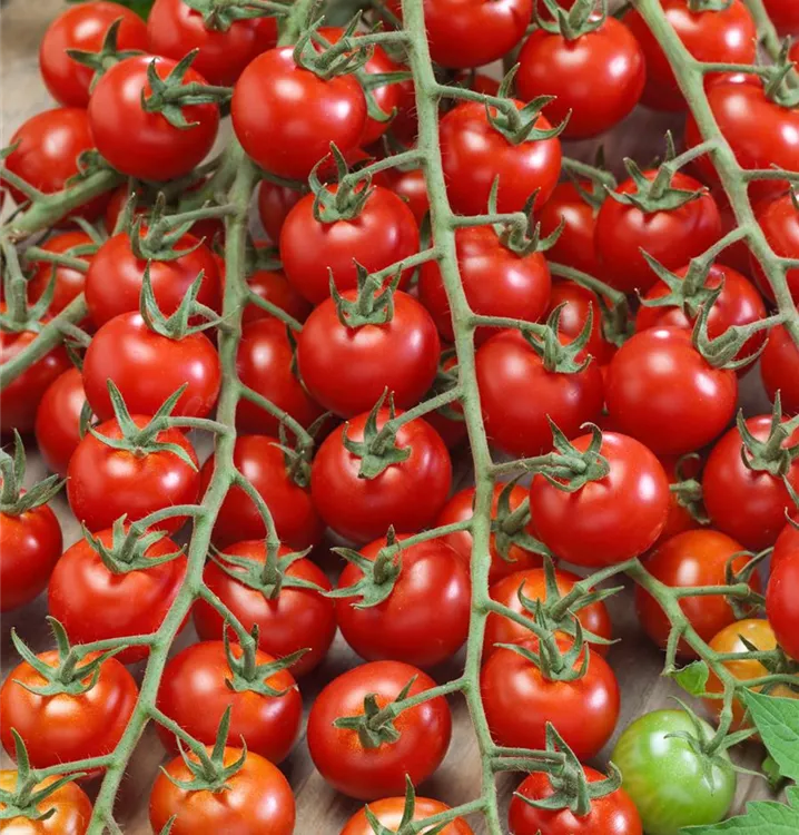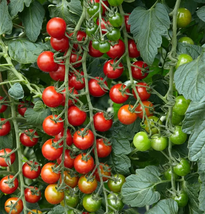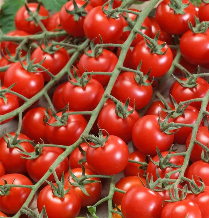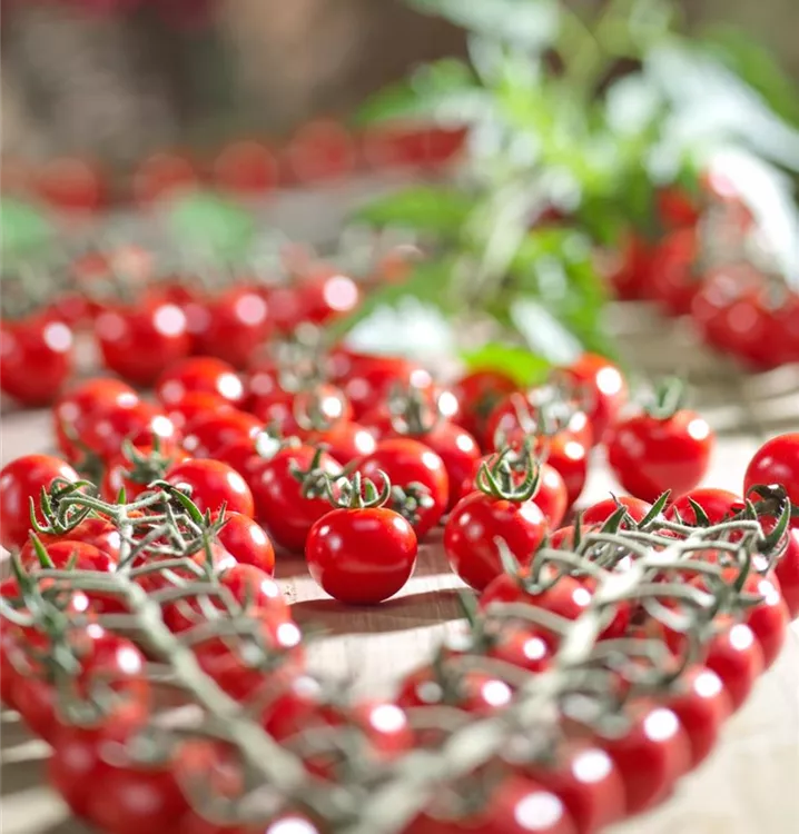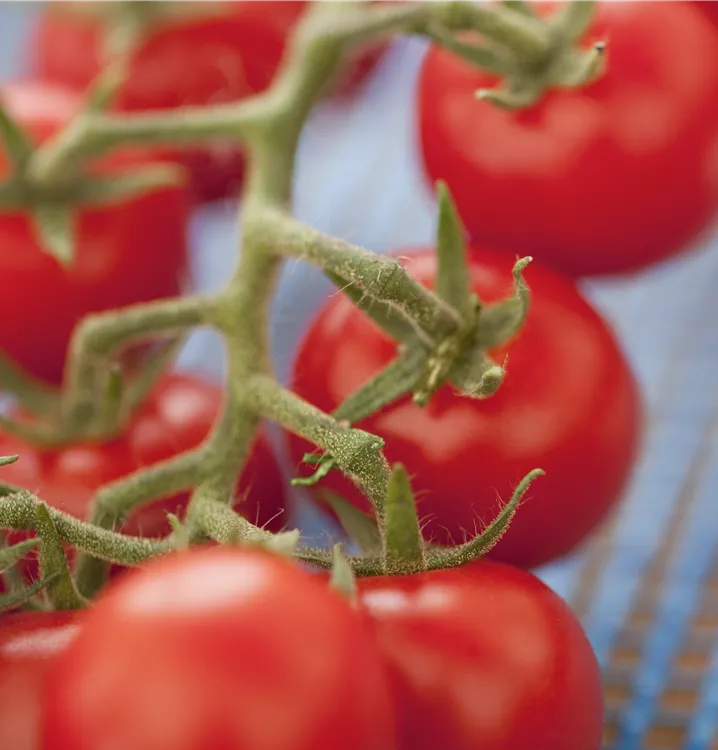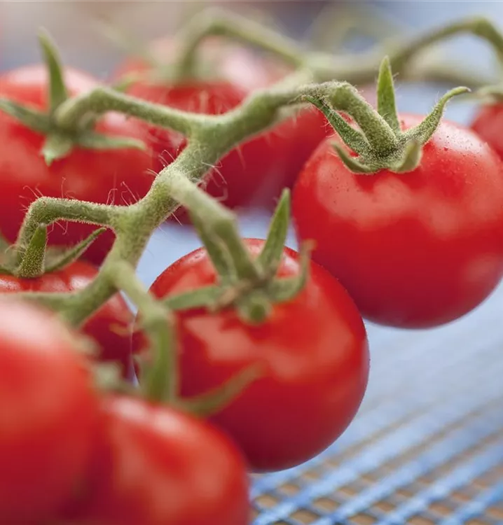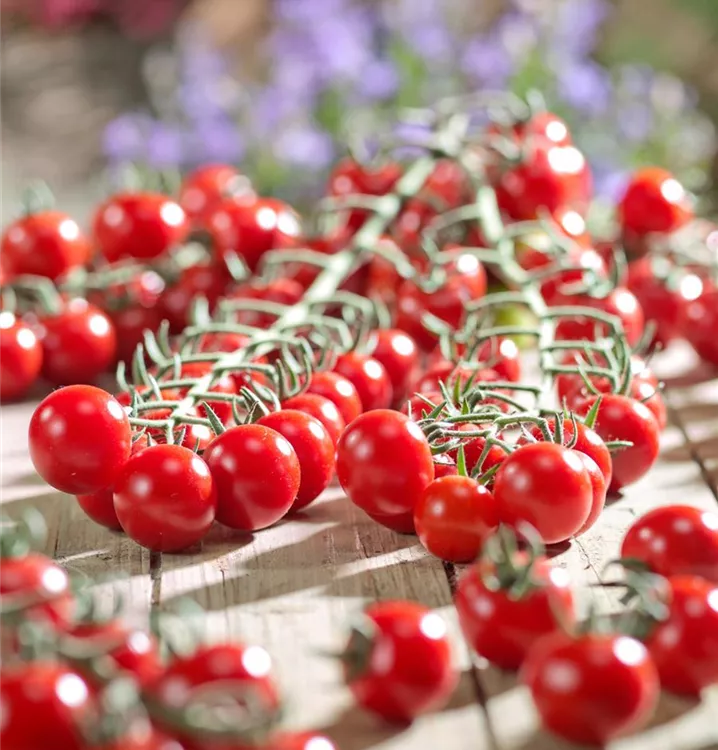 Die Tomate 'Philovita F1' (Solanum lycopersicum) bildet kleine Früchte, die aromatisch schmecken und bereits ab Juli geerntet werden können. Für das optimale Wachstum der Tomate 'Philovita F1' werden ein sonniger Standort und durchlässiger, nährstoffreicher Boden benötigt.