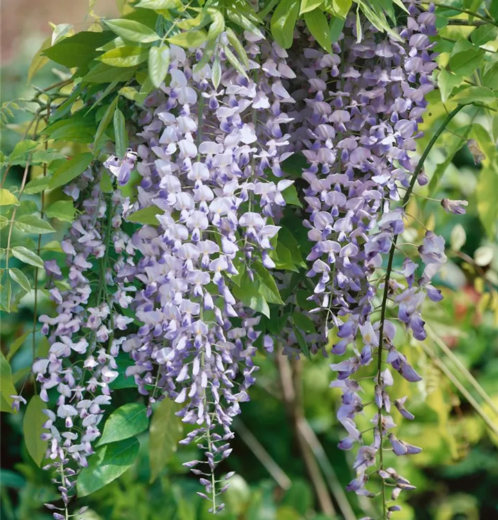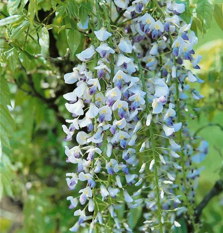 Japanischer Blauregen ist ein rankend, verzweigt wachsendes Klettergehölz, welches eine Höhe von 6 - 8 m und eine Breite von 4 - 6 m erreichen kann.