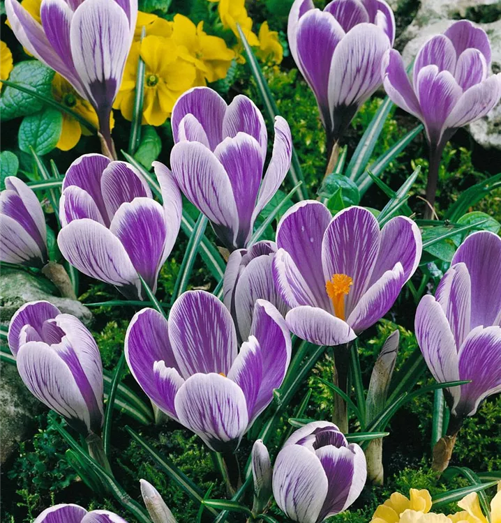 Der Frühlings-Krokus 'Pickwick' (Crocus vernus) bringt ansehnliche, gestreifte, angenehm duftende Blüten von Februar bis März hervor. Bevorzugt wird ein durchlässiger, nährstoffreicher, sandiger Boden in sonniger bis halbschattiger Lage. Die aufrechte Staude erreicht gewöhnlich eine Höhe von 10 - 15 cm und wird bis zu 5 cm breit.