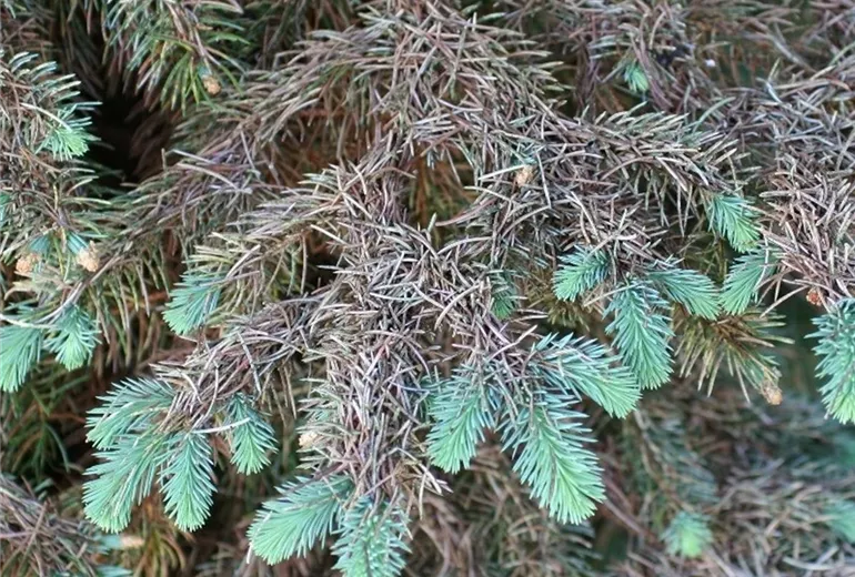 Im Mai ist an Blaufichten ein starker Nadelfall zu beobachten (Bild 1). Nur der neu gebildete Nadeljahrgang an der Triebspitze bleibt erhalten.