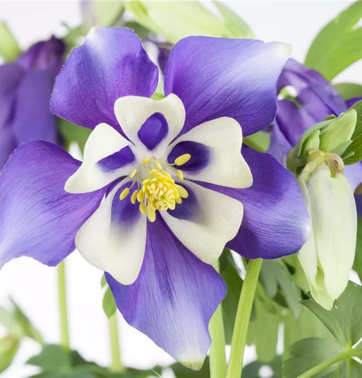 Aquilegia caerulea bildet glockenförmige, zweifarbige Blüten ab Mai. Diese werden etwa 7 - 8 cm groß.