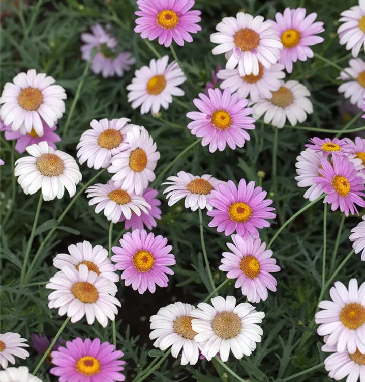 Die Strauchmargerite (Argyranthemum frutescens) ist eine beliebte Pflanze für den Balkon. Die unzähligen Blüten erscheinen, je nach Sorte, in verschiedenen Farben die ganze Saison hindurch. Ein sonniger Standort und ein durchlässiges Substrat werden bevorzugt.