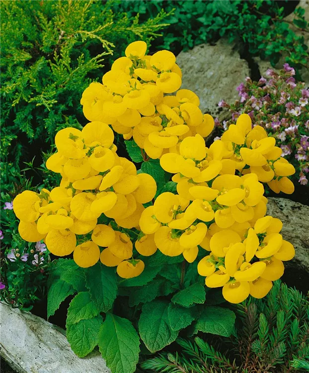 Calceolaria integrifolia bildet während der gesamten Saison zahlreiche gelbe Blüten.