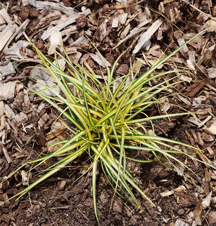 Die Gelbgrüne Garten-Segge 'Evergold' (Carex oshimensis) ist mit ihrer gelbbunten Blattfärbung ein dekoratives Gestaltungselement im Garten, welches sich an einem halbschattigen bis schattigen Standort mit einem möglichst durchlässigen, lockeren Boden am wohlsten fühlt. Die gelben Blütenwedel schmücken die überhängend und aufrecht wachsende Pflanze ab Frühling. Bei günstigen Bedingungen erreicht dieses winterharte Gras eine Höhe von ca. 30 cm und wird bis zu 35 cm breit.