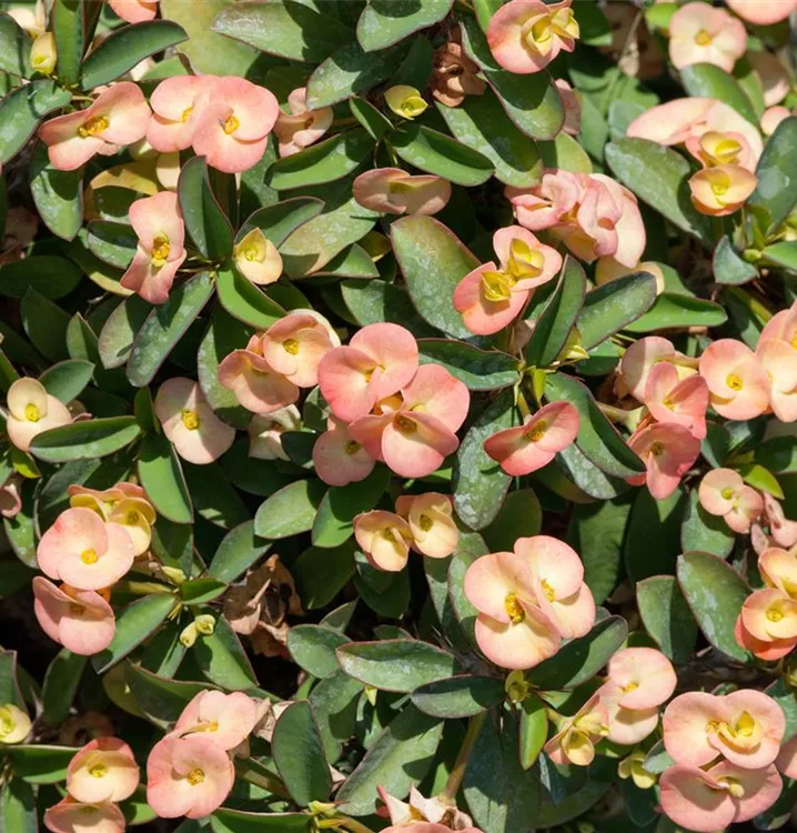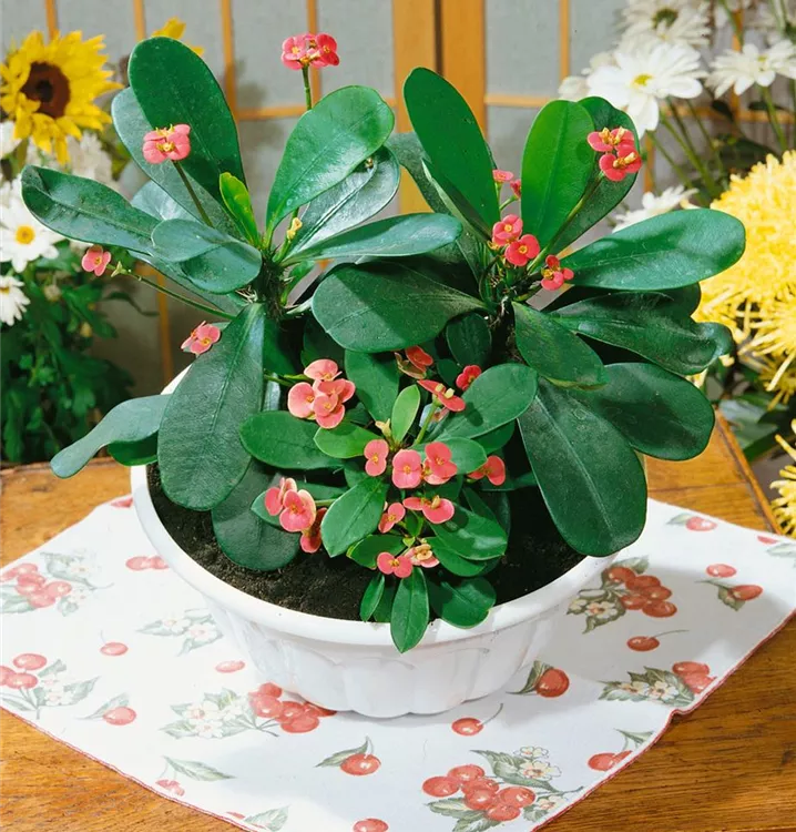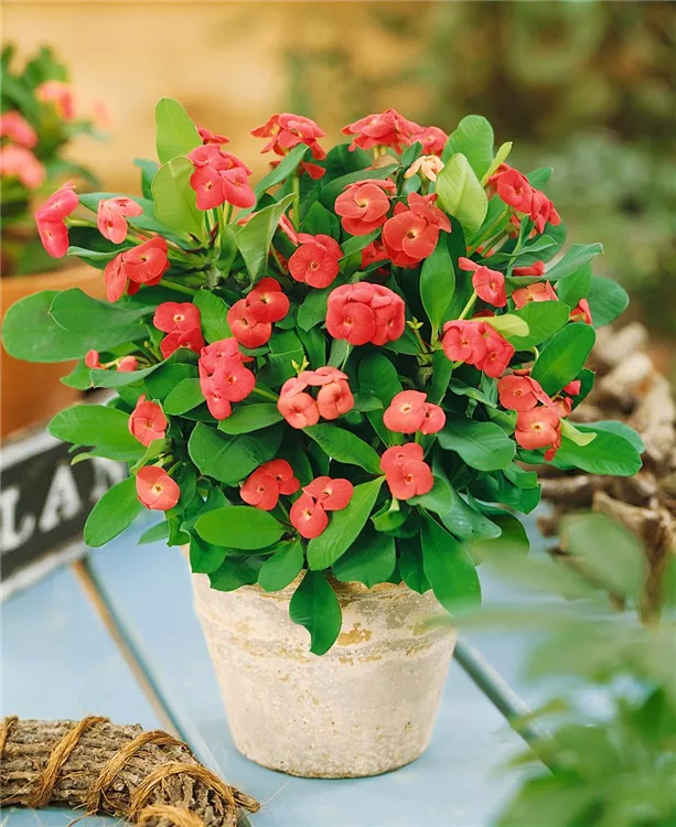 Der Christusdorn (Euphorbia milii) ist eine rot blühende Pflanze, die lanzettliche, mittelgrüne Blätter trägt. Seine tellerförmigen Blüten erscheinen in Trugdolden von November bis April. Diese kompakte und strauchartige Pflanze gedeiht am besten an einem sonnigen Standort.