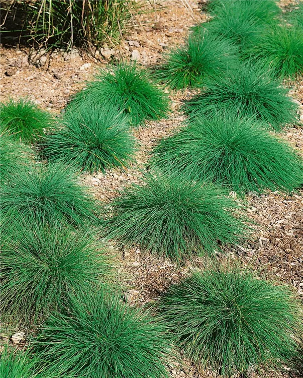Der Echte Schaf-Schwingel (Festuca ovina) ist mit seiner blau-grünen Blattfärbung ein dekoratives Gestaltungselement im Garten, welches sich an einem sonnigen Standort mit einem möglichst durchlässigen, kalkfreien Boden am wohlsten fühlt. Die braunen Blütenwedel schmücken die aufrecht und horstbildend wachsende Pflanze ab Sommer. Bei günstigen Bedingungen erreicht dieses winterharte Gras eine Höhe von ca. 30 cm und wird bis zu 30 cm breit.