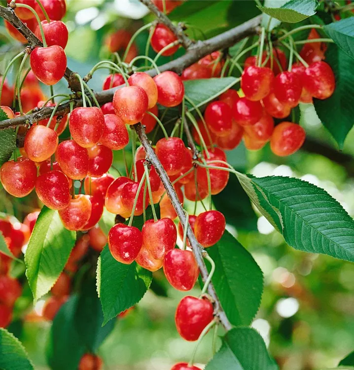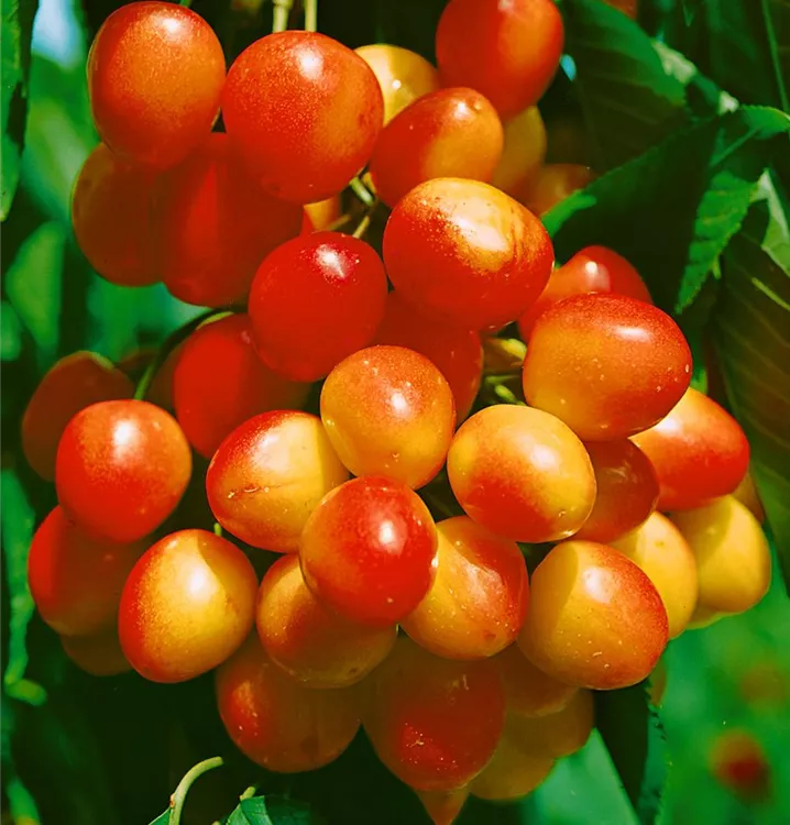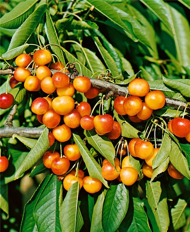 Die Süßkirsche 'Große Prinzessinkirsche' (Prunus avium) bildet gelb-rote, sehr große, saftige Früchte. Sie sind herzförmig und haben einen süß-säuerlichen Geschmack. Für eine ertragreiche Ernte ab Mitte Juni schaffen durchlässiger, kalkhaltiger, nährstoffreicher Boden und ein sonniger bis halbschattiger Standort optimale Bedingungen. Auch ihre weißen, angenehm duftenden Blüten sind eine schöne Erscheinung.