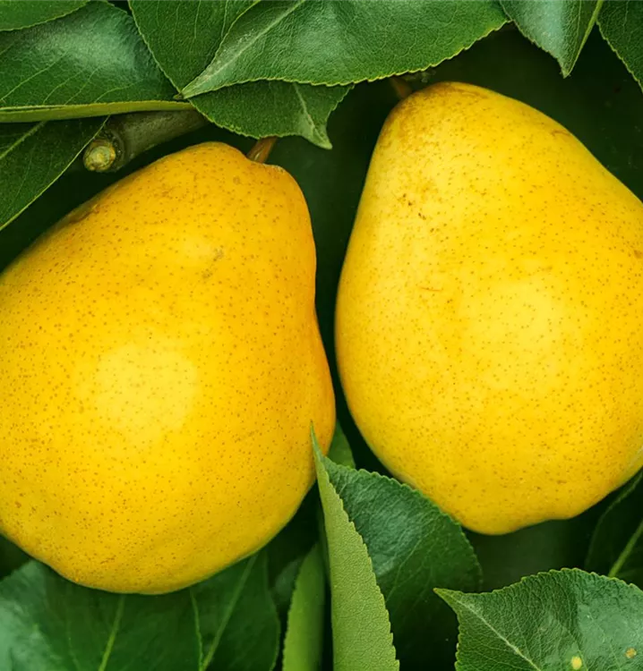 Die Sommerbirne 'Williams Christ' (Pyrus communis) bildet gelbe, mittelfeste und saftige Früchte. Sie haben einen süßen Geschmack. Für eine ertragreiche Ernte ab Mitte August schaffen lockerer, lehmiger Boden und ein sonniger bis halbschattiger Standort optimale Bedingungen. Auch ihre weißen Blüten sind eine schöne Erscheinung.