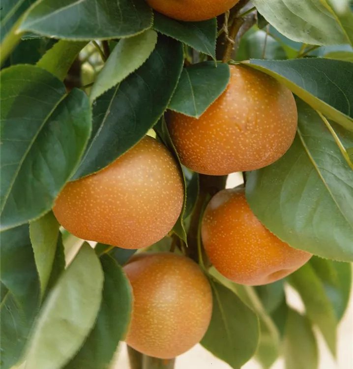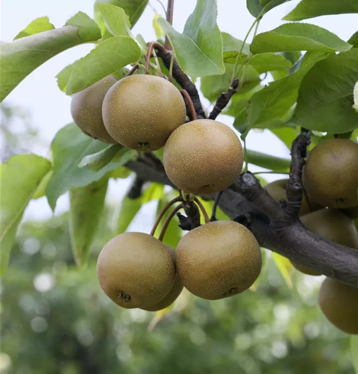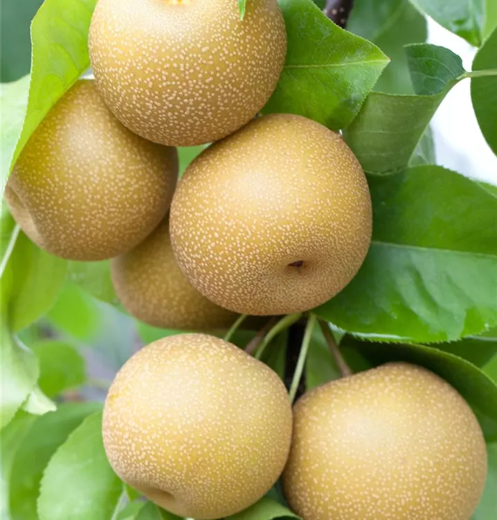 Nashi-Birne ist ein aufrecht wachsender Kleinbaum, der eine Höhe von 3 - 4 m und eine Breite von 2,5 - 3,5 m erreichen kann. In der Regel wächst sie 30 - 50 cm pro Jahr.