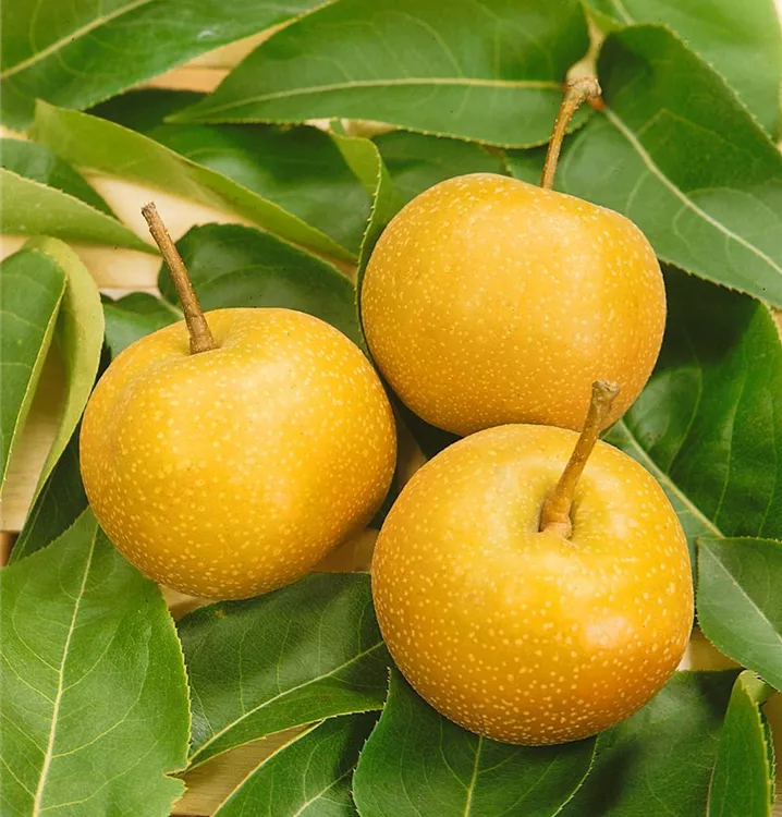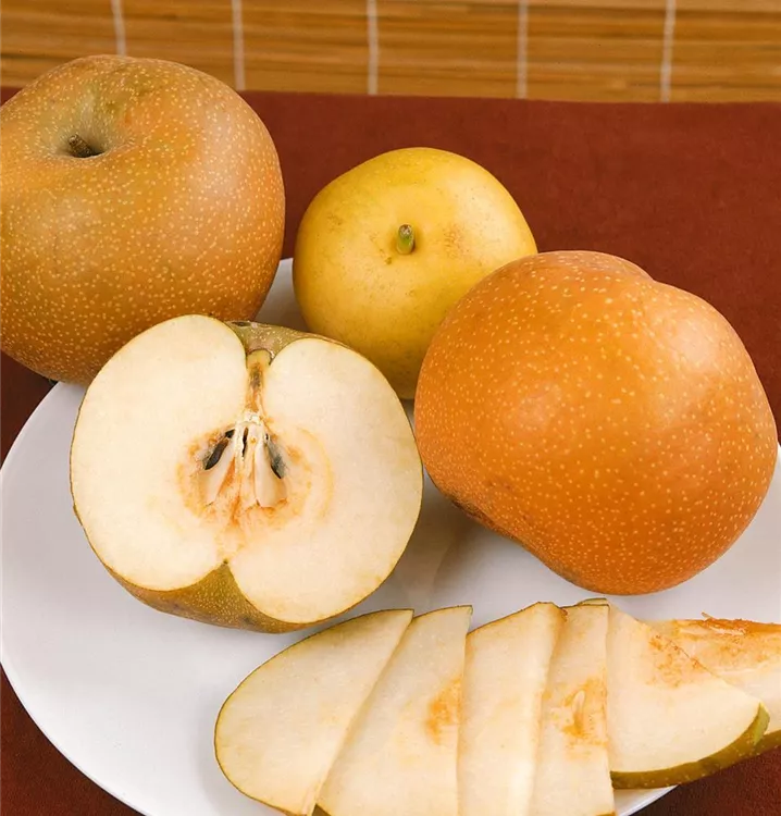 Die Nashi-Birne (Pyrus pyrifolia) bildet goldgelbe Früchte. Sie haben einen süßen, aromatischen Geschmack. Für eine ertragreiche Ernte ab Mitte August schaffen durchlässiger, nährstoffreicher Boden und ein sonniger Standort optimale Bedingungen. Auch ihre weißen Blüten sind eine schöne Erscheinung.