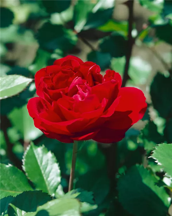 Die Strauchrose 'Isabel Renaissance'<sup>®</sup> (Rosa) ist eine reichblühende Rose, die im Garten eine besondere Rolle spielt. Die Blüten sind dunkelrot und erscheinen zahlreich von Juni bis Oktober. Mit den richtigen Begleitern an ihrer Seite, kommt die Königin der Blumen besonders gut zur Geltung. Niedrige Stauden, Lavendel und Salbei eignen sich ganz gut für diese Zwecke.