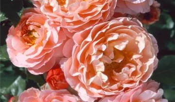 Die apricotfarbenen, gefüllten, schalenförmigen Blüten der Beetrose 'Marie Curie'® erscheinen in Dolden von Juni bis September. Diese werden etwa 6 - 8 cm groß und sind angenehm duftend.
