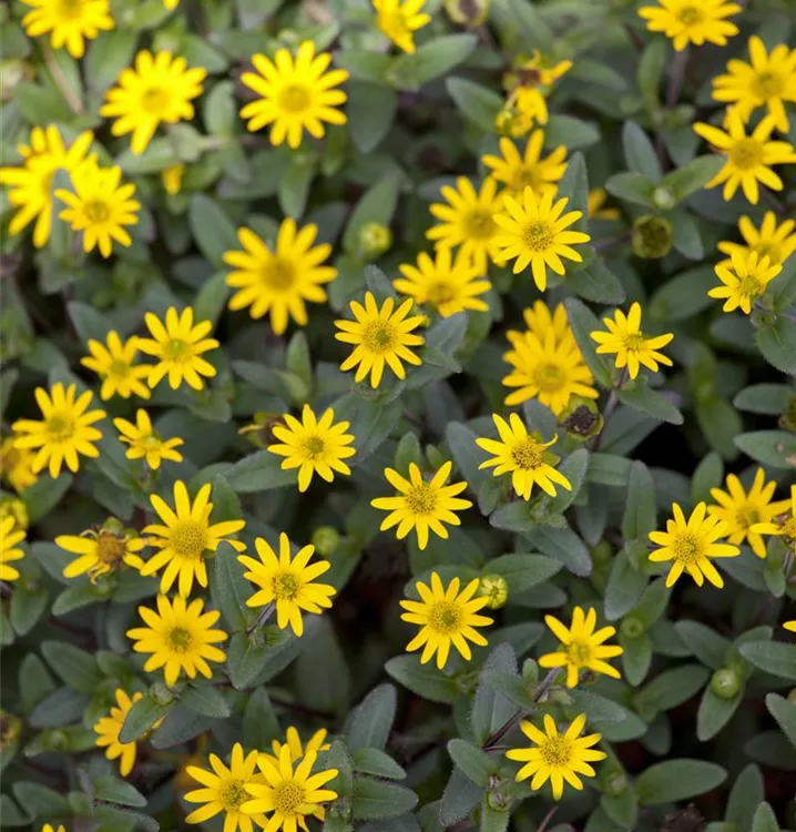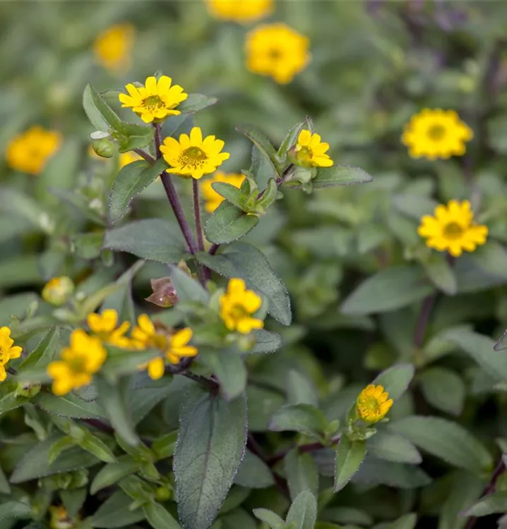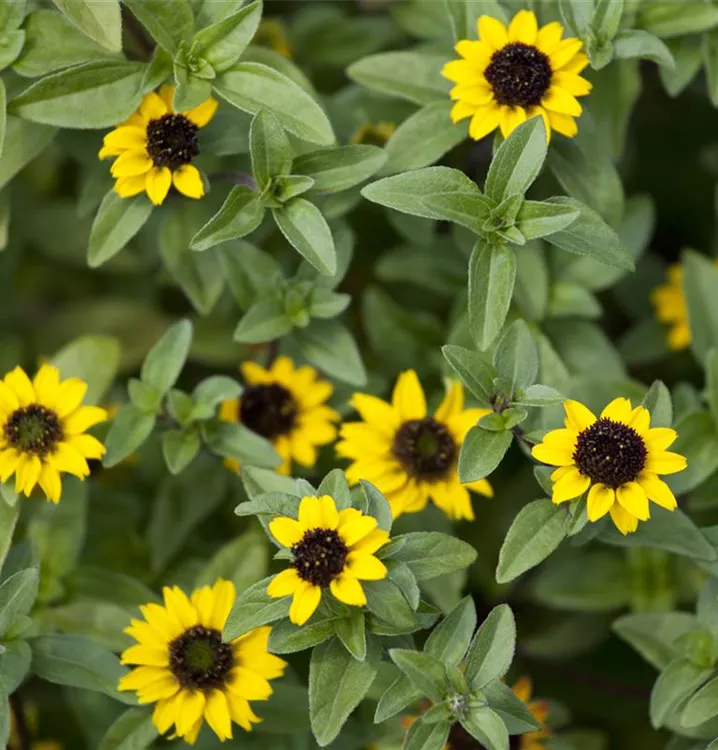 Sanvitalia procumbens bildet während der gesamten Saison zahlreiche radförmige, gelbe Blüten.