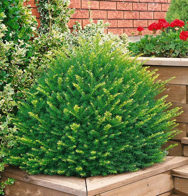 Ihre nadelförmigen Blätter haben eine dunkelgrüne Färbung. Dekorative rote Zapfen zieren Taxus baccata, Kugel ab September. Dieses Gehölz ist gut frostverträglich. Sie bevorzugt durchlässigen, kalkhaltigen, nährstoffreichen Boden in sonniger bis halbschattiger Lage.